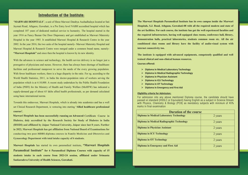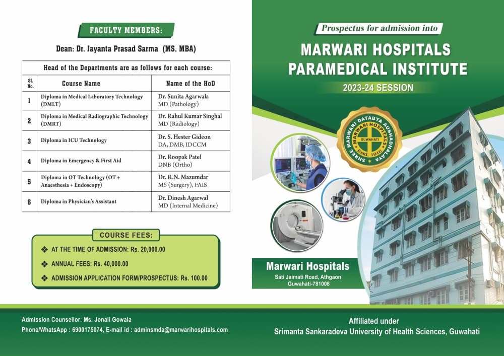 Marwari Hospitals has started venturing into allied professional medical courses and has started its own paramedical institute in Guwahati - Marwari Hospitals Paramedical Institute for 6 Paramedical Diploma Courses with capacity of 15 students intake in each course from 2023-24 session, affiliated under Srimanta Sankaradeva University of Health Sciences, Guwahati.